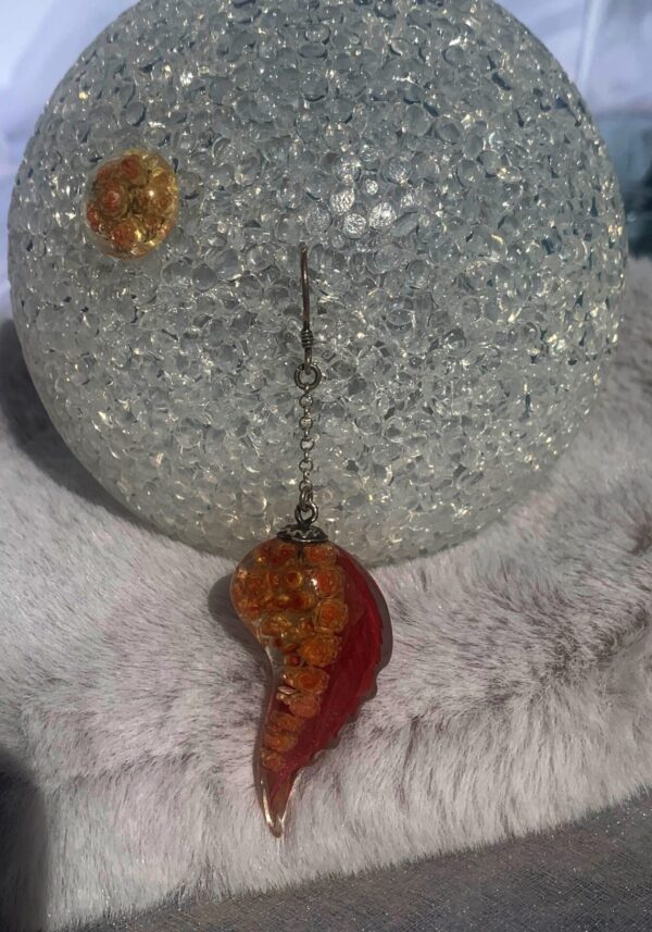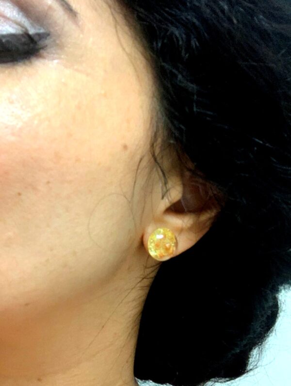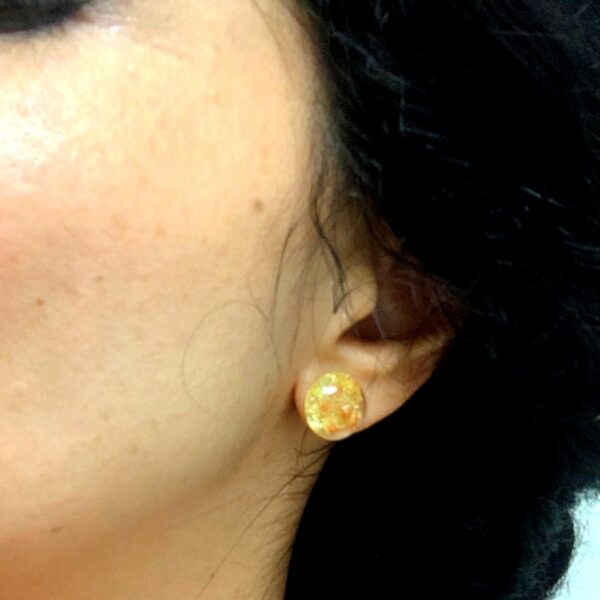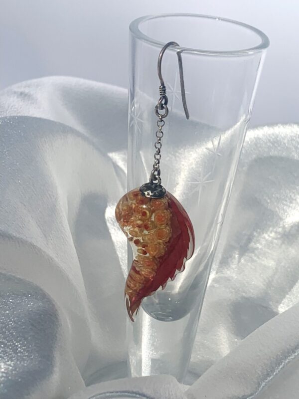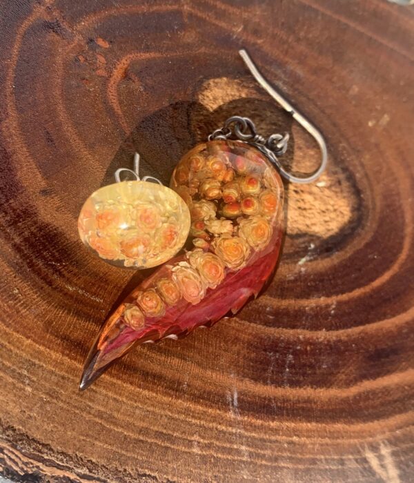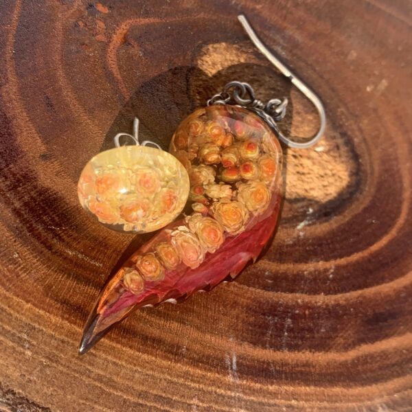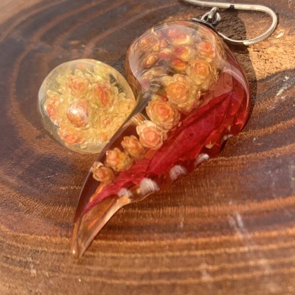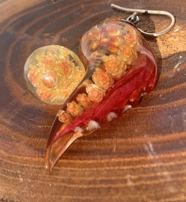 · Handmade Item · Metal: Sterling silver 925K · Materials: Immortelle flowers, wild red grape leaves, coniferous species resin (see below the description of this 100% natural product) · Earring type– One pair is a stud earring , the other pair is a wire dangle earring |