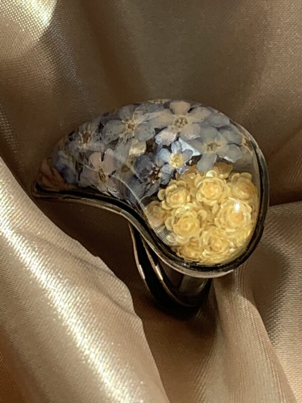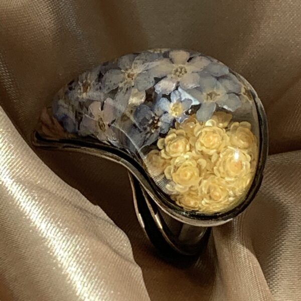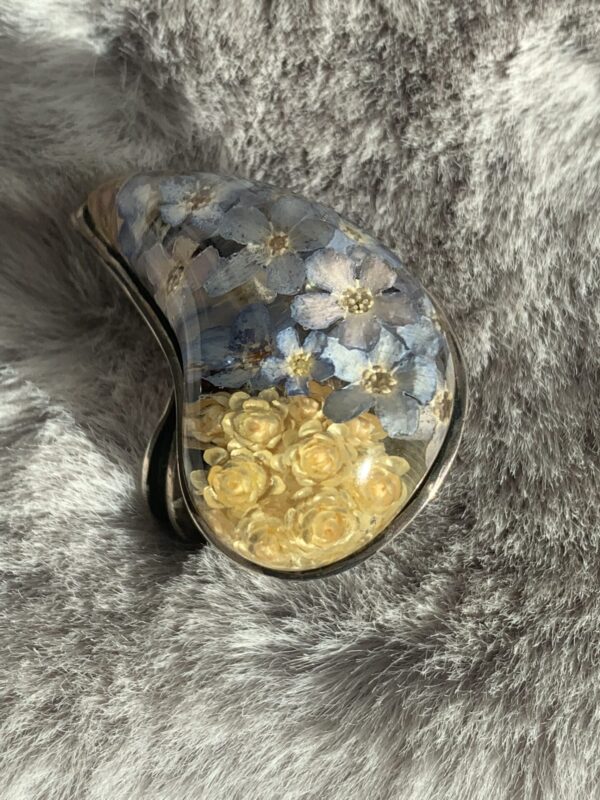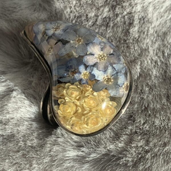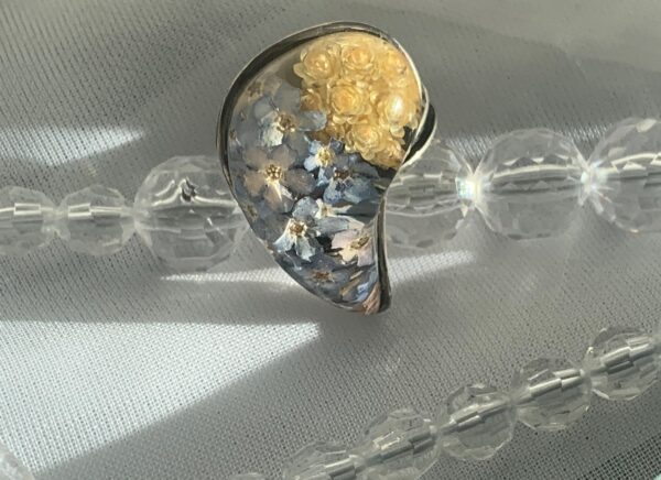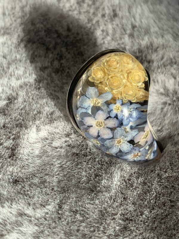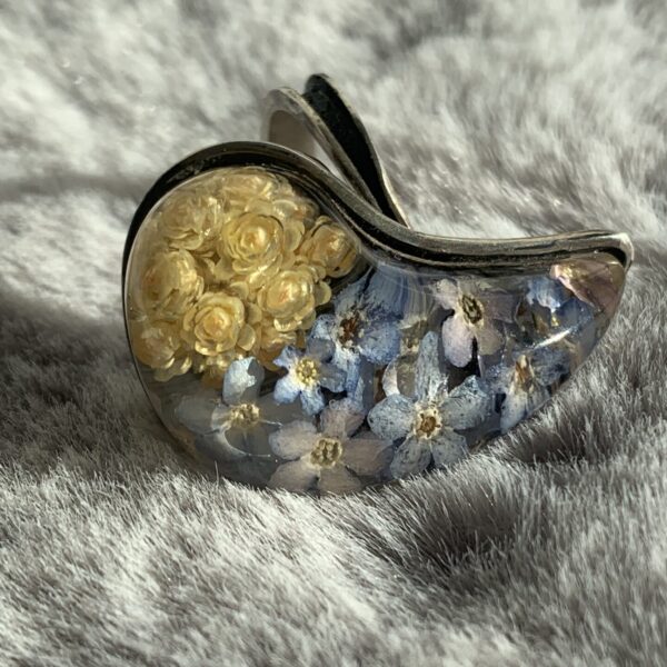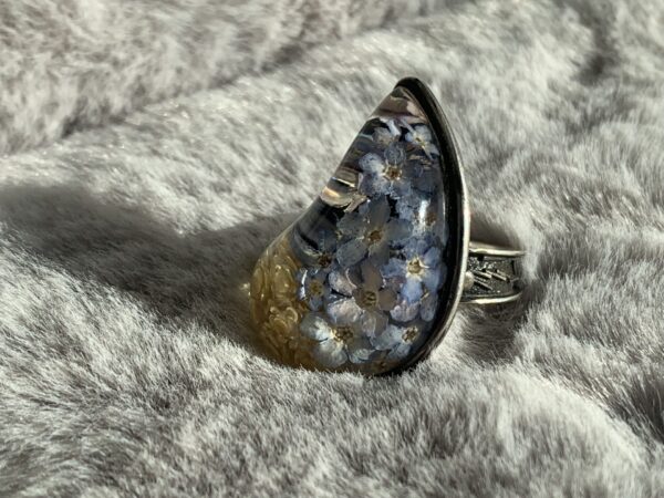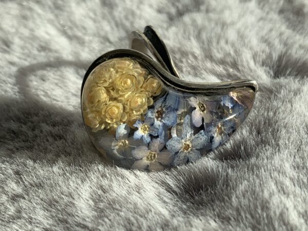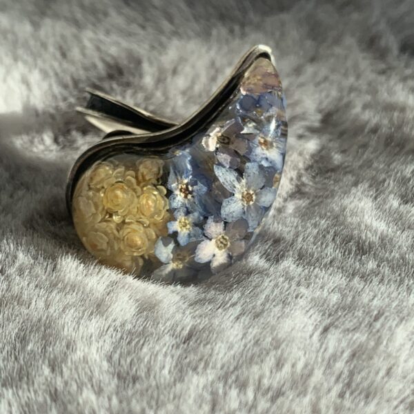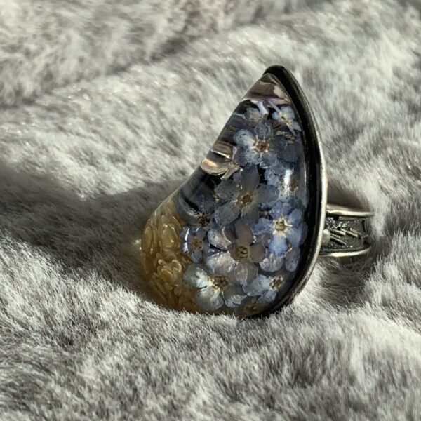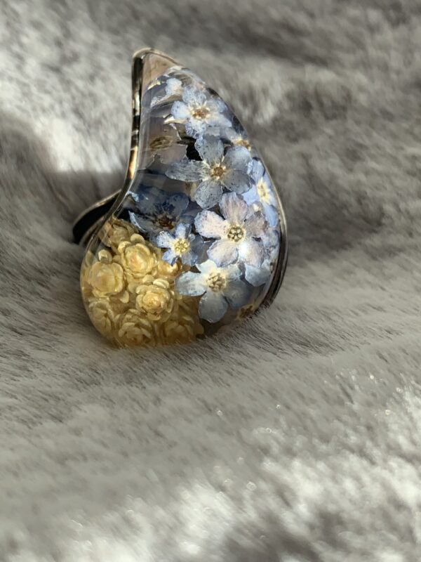 This elegant raindrop-shaped ring encapsulates the beauty of nature within its design. The Rain-kissed morning ring features real Immortelle flowers and Forget-Me-Nots carefully arranged and preserved within a clear, glass-like resin. The ring has a deep and enchanting symbolism. Forget-me-nots symbolize remembrance, true love, and fidelity. In various mythologies and folklore, Immortelle flowers are associated with eternal life, resurrection, and divine purity. They are also linked to stories of undying love and the everlasting soul. The raindrop shape of the ring embodies the essence of purity, renewal, and transformation, like raindrops which bring nourishment and growth to the earth. Wearing this nature-inspired ring is like carrying a piece of nature’s poetry which reminds the wearer of the enduring beauty of love, the resilience of the soul, and the importance of cherished memories.