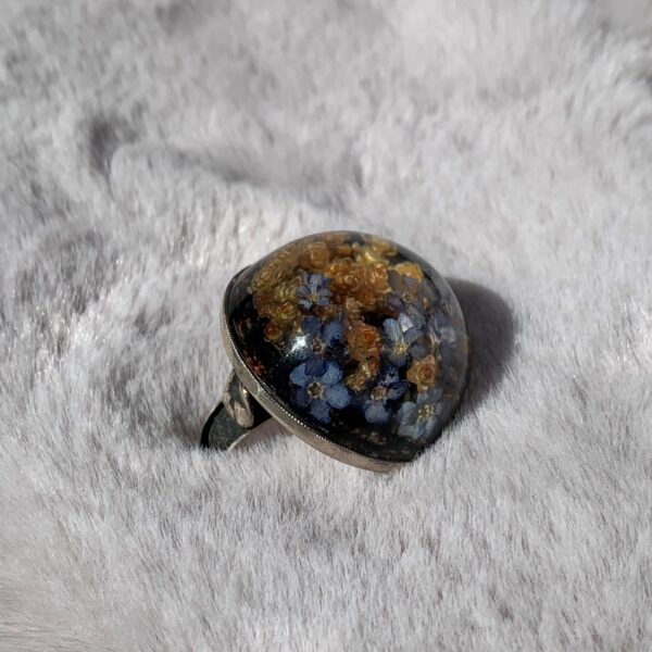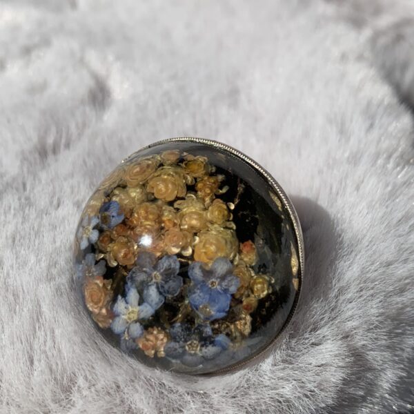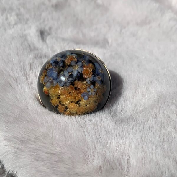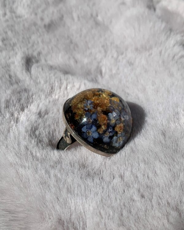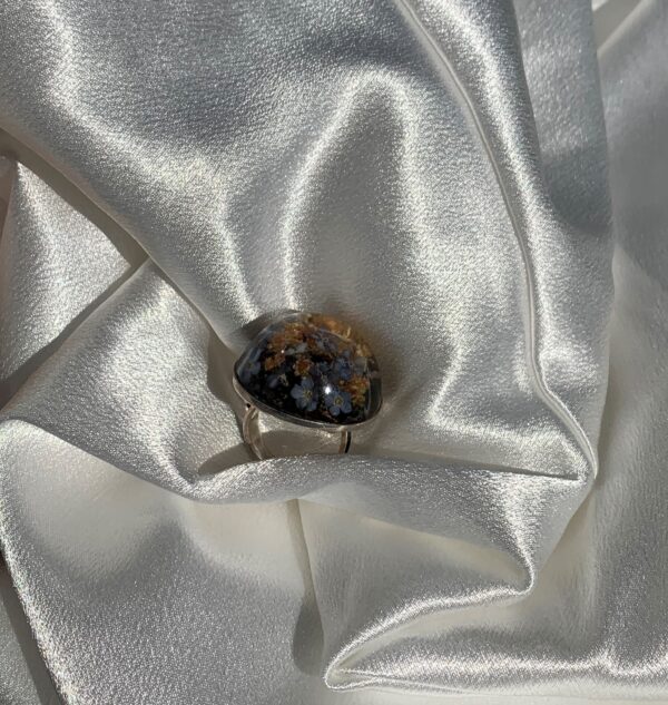 “Magical embrace of Eternity” ring is a stunning tapestry of nature’s elegance. The combination of forget-me-nots and immortelle flowers crafted in a classic round design makes the ring a symbol of everlasting love and cherished moments. The circular shape of the ring represents the unending cycle of life, while the forget-me-not flowers symbolize love and the everlasting connection between two souls. Immortelle flowers, known for their resilience and eternal beauty, represent the timeless nature of memories and the precious moments that linger in our hearts forever. Whether given as a token of affection or worn as a symbol of a profound commitment and remembrance the “Magical Embrace of Eternity” ring is a reminder of the enduring love and memories that will be cherished for generations to come.